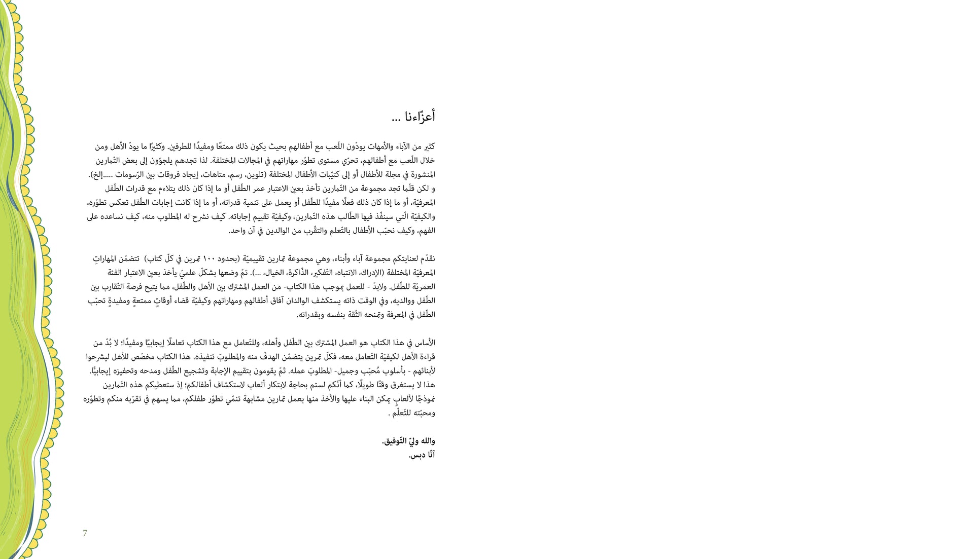 مجموعة آباء وأبناء هي مجموعة تمارين تقييمية تتضمن المهارات المعرفيّة المختلفة (الإدراك، الانتباه، التفكير، الذاكرة، الخيال.. وغيرها) تم وضعها بشكل علمي يأخذ بعين الاعتبار الفئة العمرية للطفل. ولابد - للعمل بموجب هذا الكتاب- من العمل المشترك بين الأهل والطفل، مما يتيح فرصة التقارب بين الطفل ووالديه، وفِي الوقت ذاته يستكشف الوالدان آفاق أطفالهم ومهاراتهم وكيفيّة قضاء أوقاتٍ ممتعةٍ ومفيدةٍ تحبب الطفل في المعرفة وتمنحه الثقة بنفسه وبقدراته.