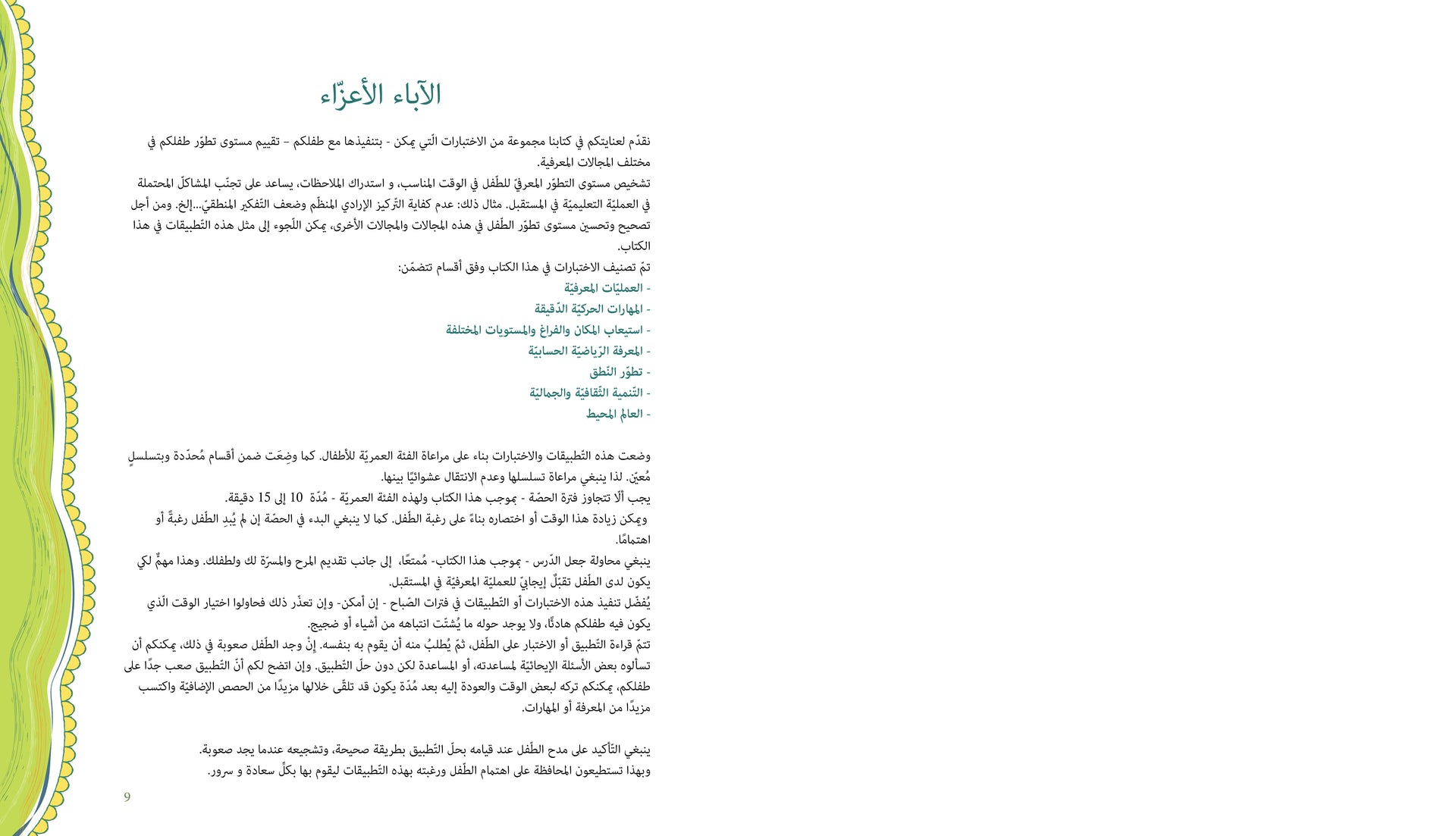 تستند هذه التمارين التقييمية إلى المعارف العلمية والنظرية في التربية وعلم النفس، مع الأخذ بالتوصيات المنهجية من أعمال مختصين في مجالي التربية وعلم النفس. وتمت ملاءمة هذه التمارين وتبسيطها لتكون أكثر تكيفًا مع البيئة الاجتماعية والثقافية للمجتمع ولتكون مبسطة ومفهومة للأهل.
