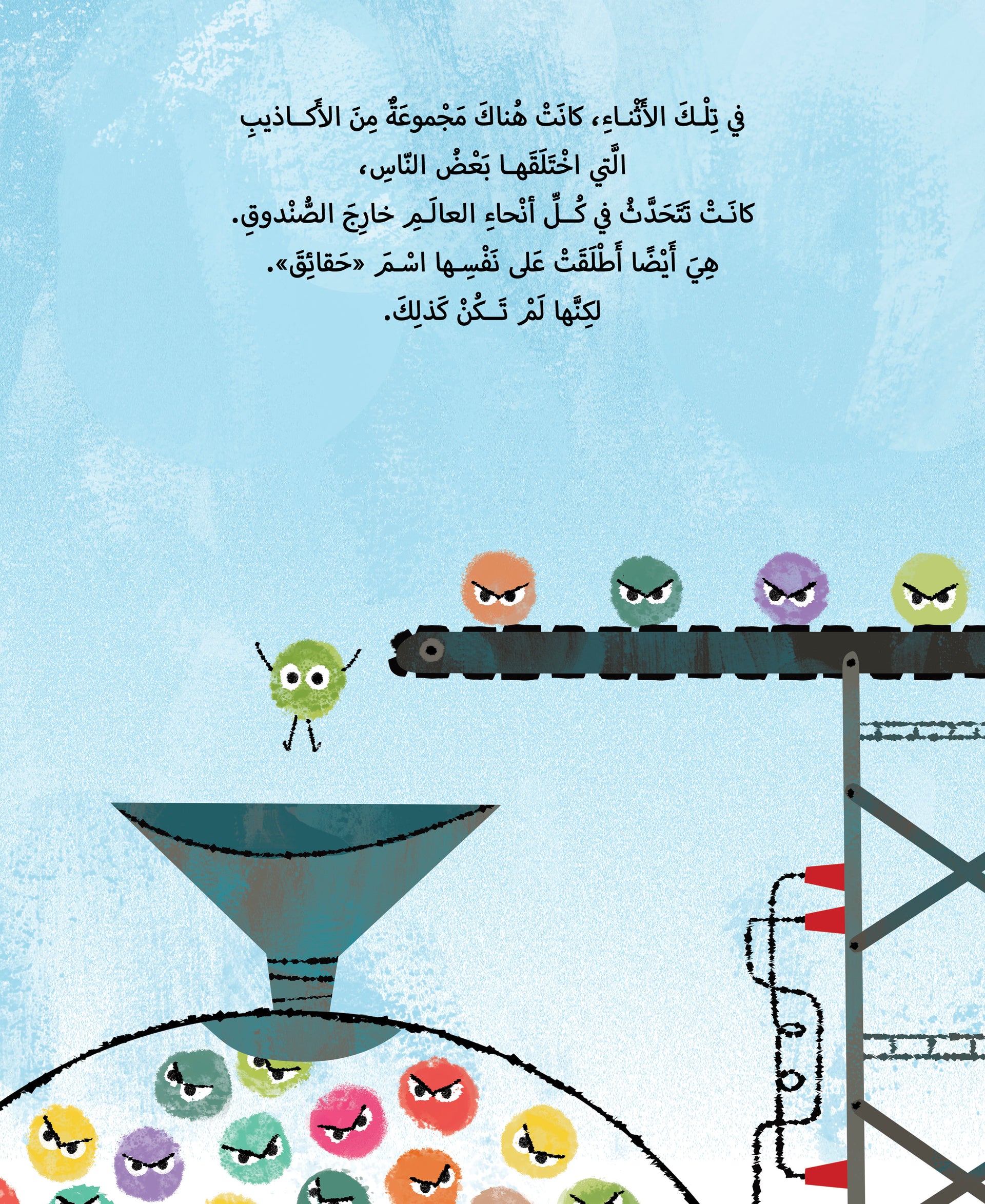 وعندما حاول بعضهم أن يجعل الحقيقة الحزينة الصغيرة تعترف بأنها ليست حقيقة، رفضت، فغضبوا منها، وأخفوها هي وباقي الحقائق في صندوق تحت الأرض. وعندها انتشرت الأكاذيب في كل مكان، وظنّ الناس أنها حقائق. لكنّ الحقيقة لا يمكن أن تغيب إلى الأبد، وهكذا خرجت الحقائق إلى النور، بمساعدة مستكشفي الحقائق الماهرين، فأضاء العالم بها، وتلاشت كل الأكاذيب.
