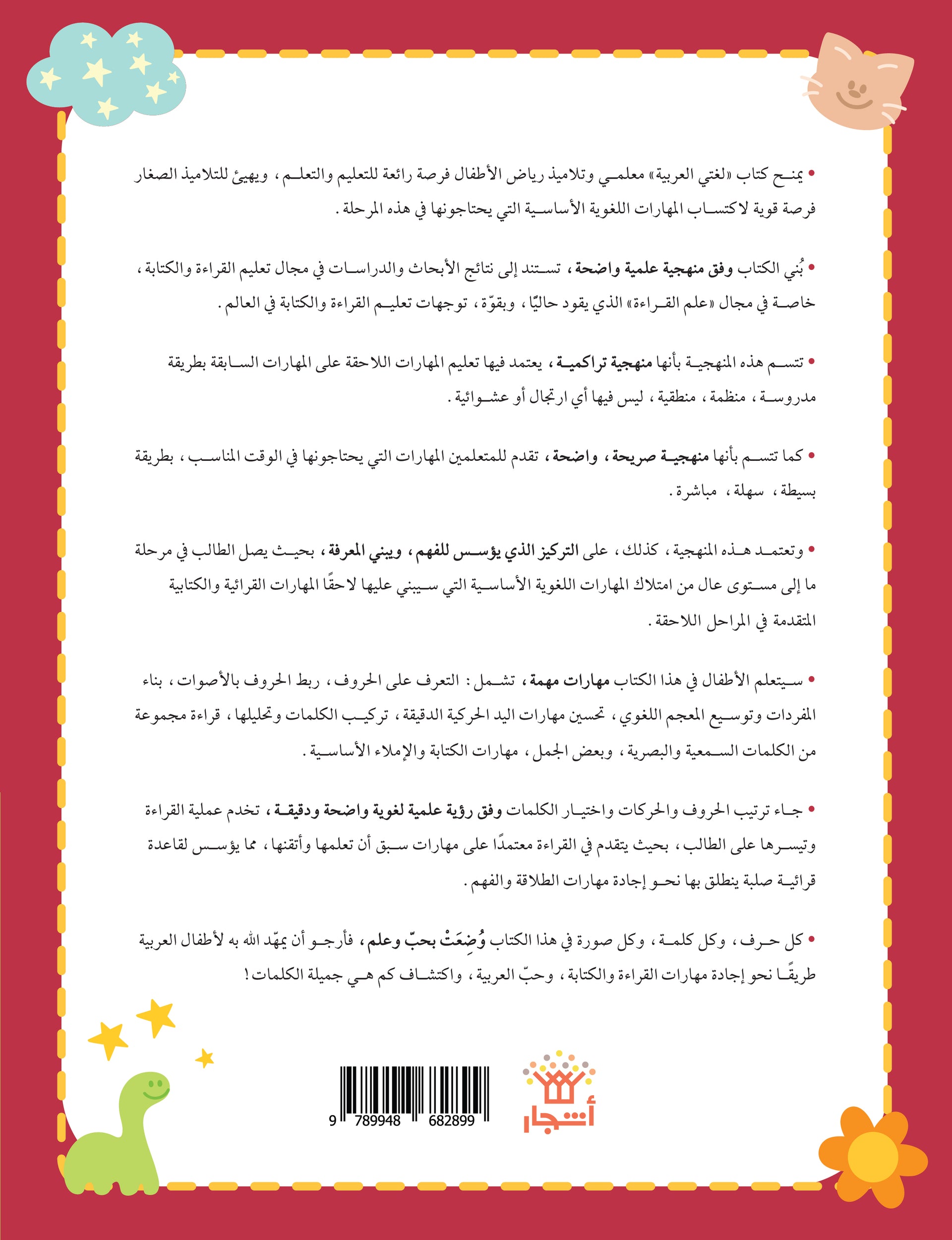 يمنح كتاب «لغتي العربية» معلمي وتلاميذ رياض الأطفال فرصة رائعة للتعليم والتعلم، ويهيئ للتلاميذ الصغار فرصة قوية لاكتساب المهارات اللغوية الأساسية التي يحتاجونها في هذه المرحلة. بُني الكتاب وفق منهجية علمية واضحة، تستند إلى نتائج الأبحاث والدراسات في مجال تعليم القراءة والكتابة، خاصة في مجال «علم القراءة» الذي يقود حاليًّا، وبقوّة، توجهات تعليم القراءة والكتابة في العالم.